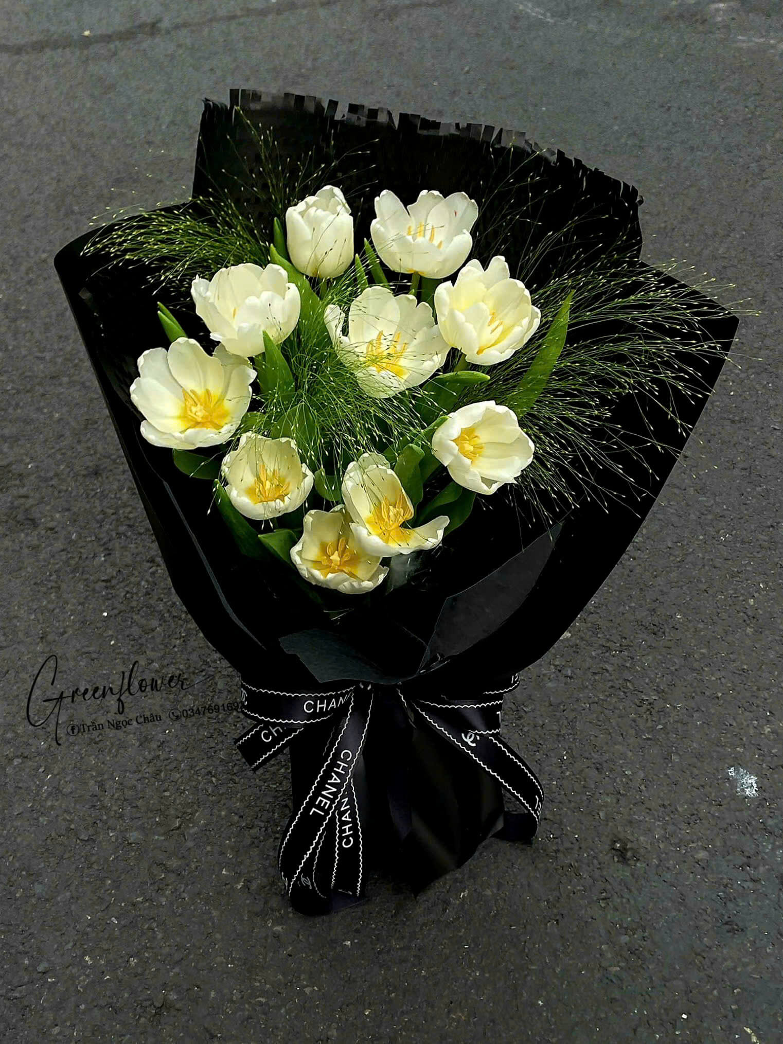 • Thành phần : 10 bông hoa tulip trắng nhập khẩu hà lan .( giấy phối theo yêu cầu )